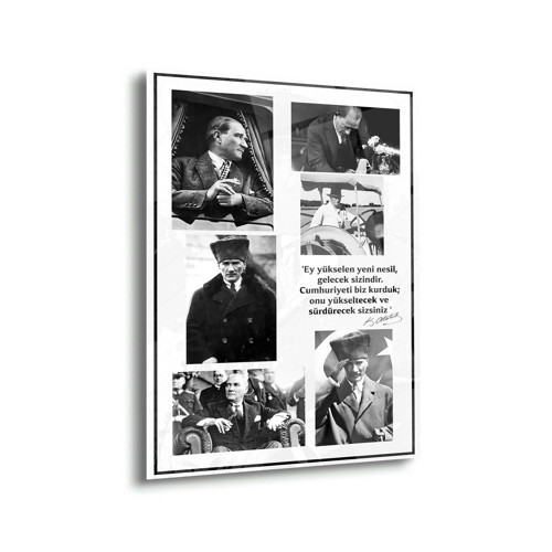 Siyah-beyaz fotoğraflardan oluşan bu özel kompozisyon, Atatürk’ün liderliğini ve Cumhuriyetin kuruluş sürecindeki önemli anlarını yansıtır. Tasarımın merkezinde yer alan Atatürk fotoğrafı ve çevresindeki kareler, hem tarihi bir atmosfer hem de modern bir dekoratif görünüm oluşturur.
