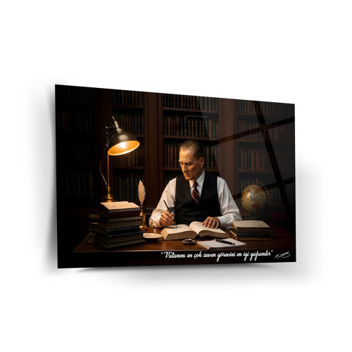Mustafa Kemal Atatürk’ün çalışma masasındaki güçlü ve düşünceli duruşunu yansıtan bu özel tasarım, bilgi, disiplin ve sorumluluk duygusunu dekoratif bir sanat eseriyle buluşturur.