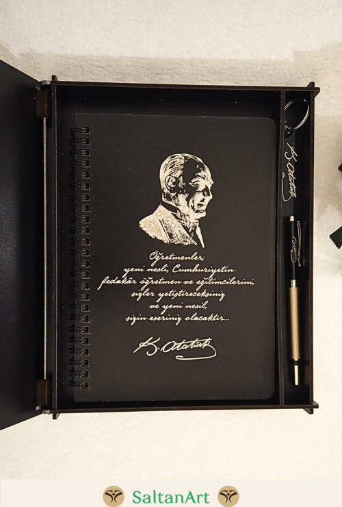 SaltanArt Atatürk Temalı Defter Kalem Anahtarlık Özel Ahşap Kutulu Premium Hediye Siyah Renk