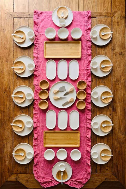 Set, hem porselen hem de doğal ahşap (bambu) ürünlerden oluşan zengin bir içeriğe sahiptir: