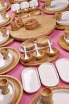 Doğal bambu ürünler ile birlikte yüksek kaliteli seramik parçaların harmanlandığı bu takım; kahvaltı, brunch ya da özel misafir sofralarınızda işlevsel ve göz alıcı bir deneyim sunar.