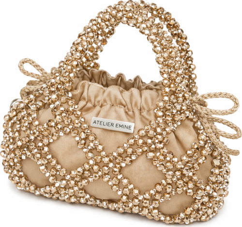 Budino Creta, Atelier Emine’in Crystal Gelato Couture koleksiyonunda yer alan; tek parça couture yaklaşımıyla ele alınmış, tekstil ve kristal işçiliğinin heykelsi bir birliktelik sunduğu top-handle pouch bag tasarımıdır.