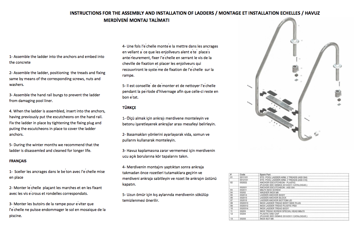 Genişlik 500 mm. Kollar Ø 42 mm AISI 304 paslanmaz çelik borudan, paslanmaz çelik basamakları, plastik ankrajları ve rozetleri ile komple.