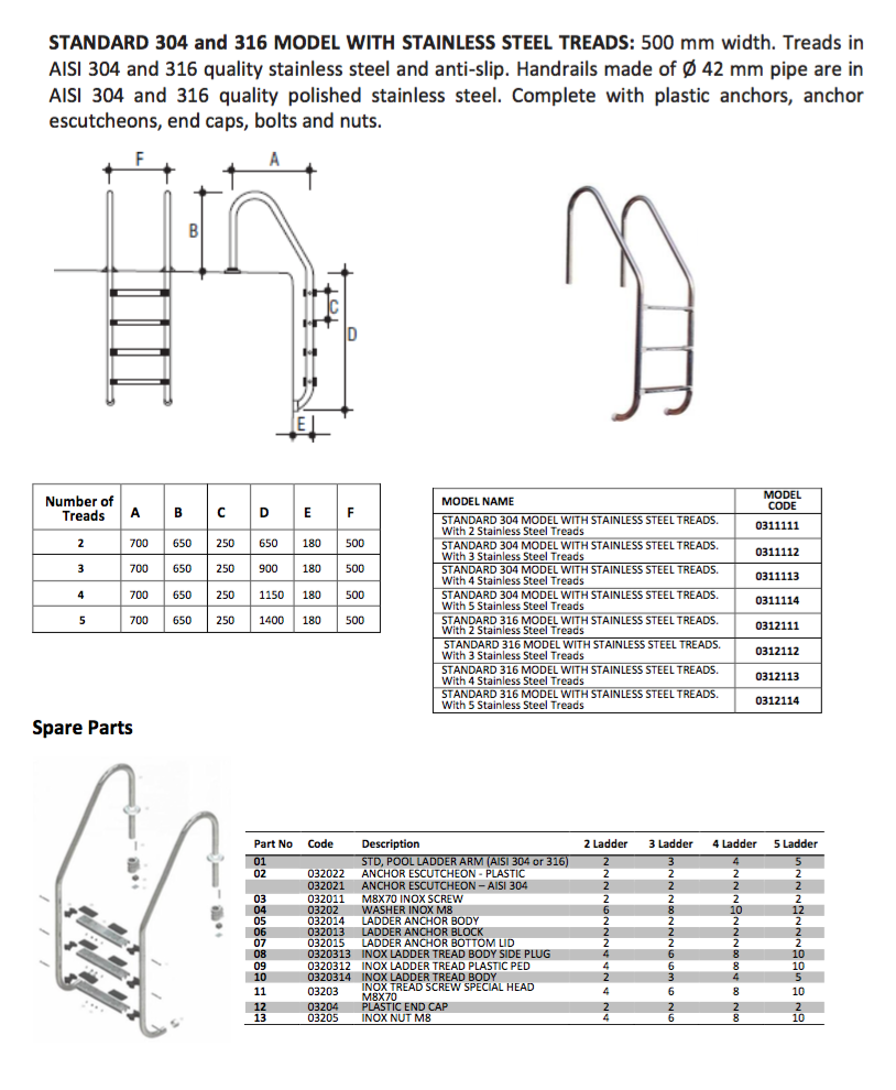 500 mm width. Treads in AISI 304 quality stainless steel and anti-slip. Handrails made of Ø 42 mm pipe are in AISI 304 quality polished stainless steel. Complete with plastic anchors, anchor escutcheons, end caps, bolts and nuts.