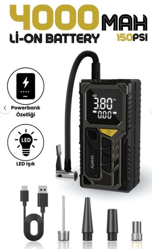 Auhma A7777 Dijital LCD Ekranlı 4000 MAH Hava Kompresörü / Powerbank Özellikli Şişirme Pompası