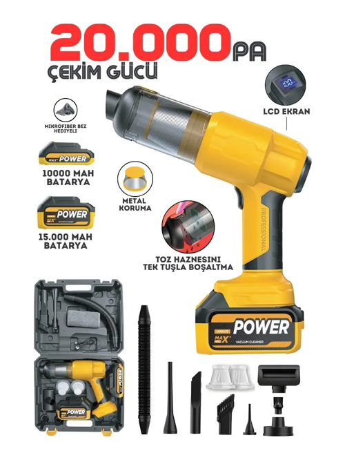 Bagajon Auhma AHV-21 20.000Pa Şarjlı Dijital Göstergeli Araç Süpürgesi 25.000Mah - Çift Bataryalı Profesyonel Set