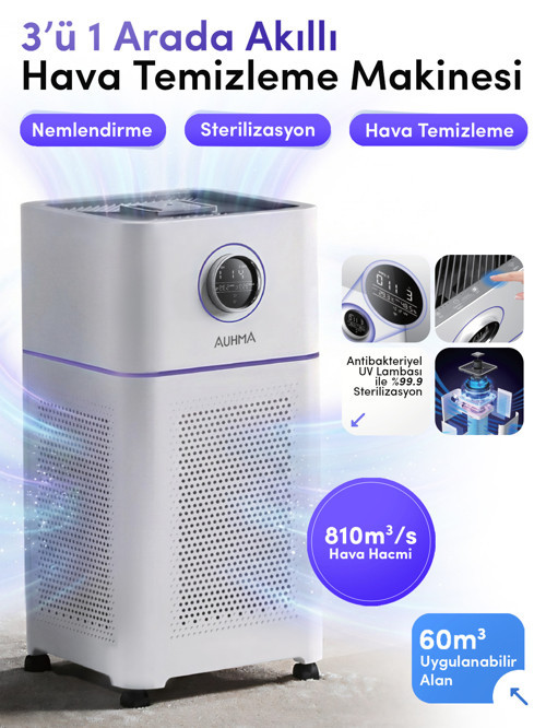 AUHMA ARP-003, modern yaşam alanlarının en büyük ihtiyacı olan temiz ve nemli havayı tek bir akıllı sistemde birleştirir. Sadece tozu süzmekle kalmayan bu cihaz, UV-C Sterilizasyon teknolojisi ile mikropları %99.9 oranında etkisiz hale getirirken, entegre nemlendirme özelliği ile kış aylarındaki kuru hava sorununu ortadan kaldırır.