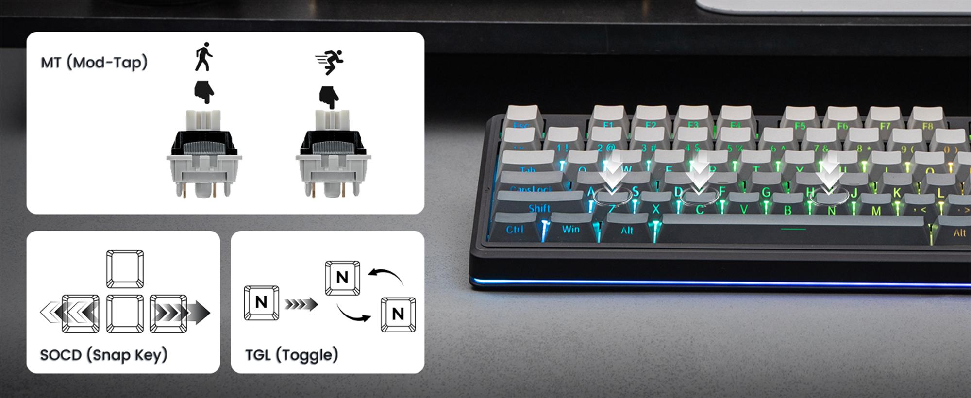 AULA F87 PRO V2'nin özelleştirilebilir sürücüsü ile her tuş vuruşuna hükmedin. Yazılım üzerinden RGB aydınlatma ayarları, makro düzenleme, sistem ayarları ve ekran özelleştirmelerini kolayca yapabilirsiniz. Ayrıca oyunlarda büyük avantaj sağlayan Gelişmiş Tuş fonksiyonlarına sahiptir: