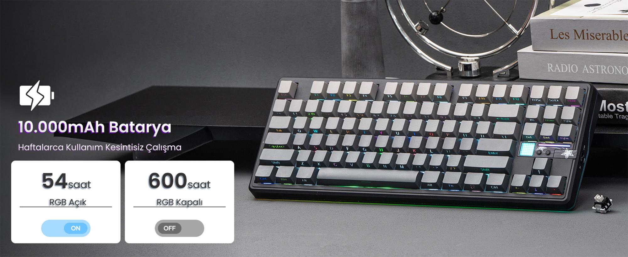 AULA F87 PRO V2, yüksek kapasiteli 10.000 mAh bataryası sayesinde uzun süreli kullanım imkanı sunar. RGB aydınlatma açıkken yaklaşık 54 saate kadar kesintisiz kullanım sağlarken, RGB kapalı modda bu süre 600 saate kadar çıkabilir. Bu güçlü batarya kapasitesi, sık şarj etme ihtiyacını ortadan kaldırarak kesintisiz çalışma ve oyun deneyimi sunar.