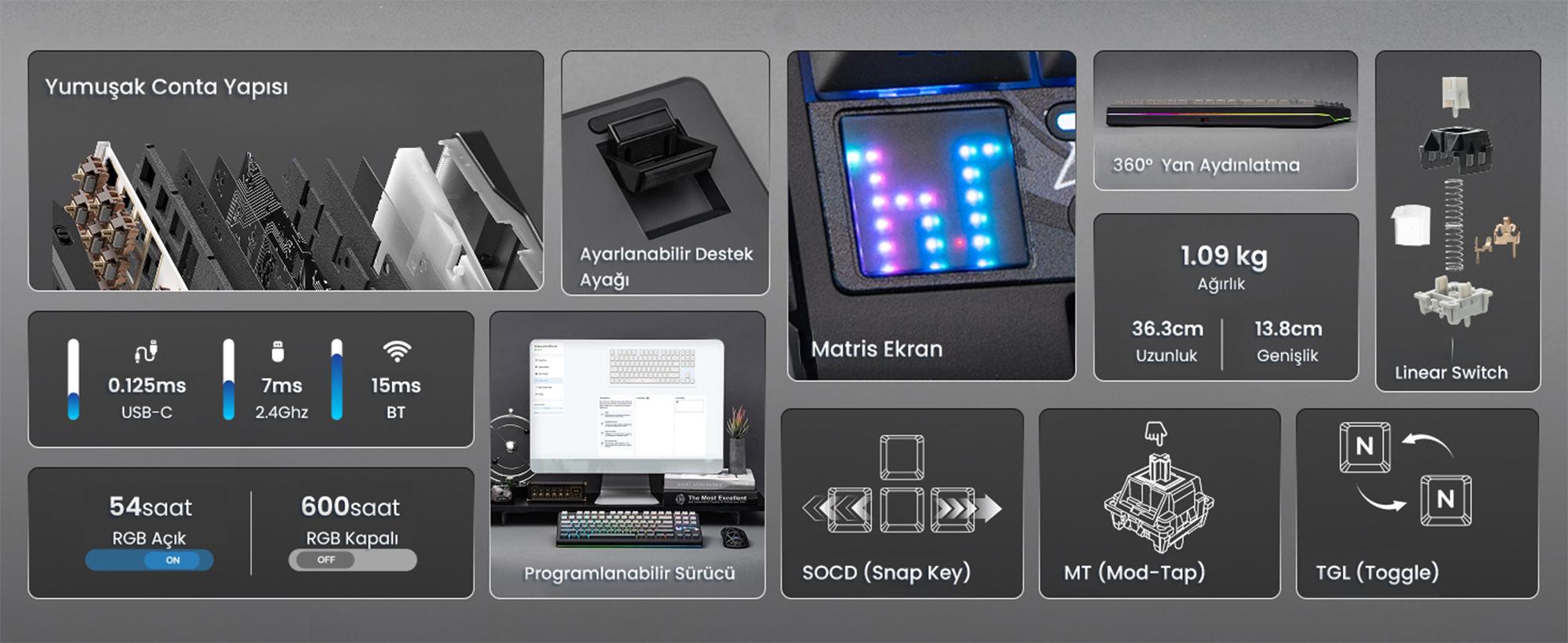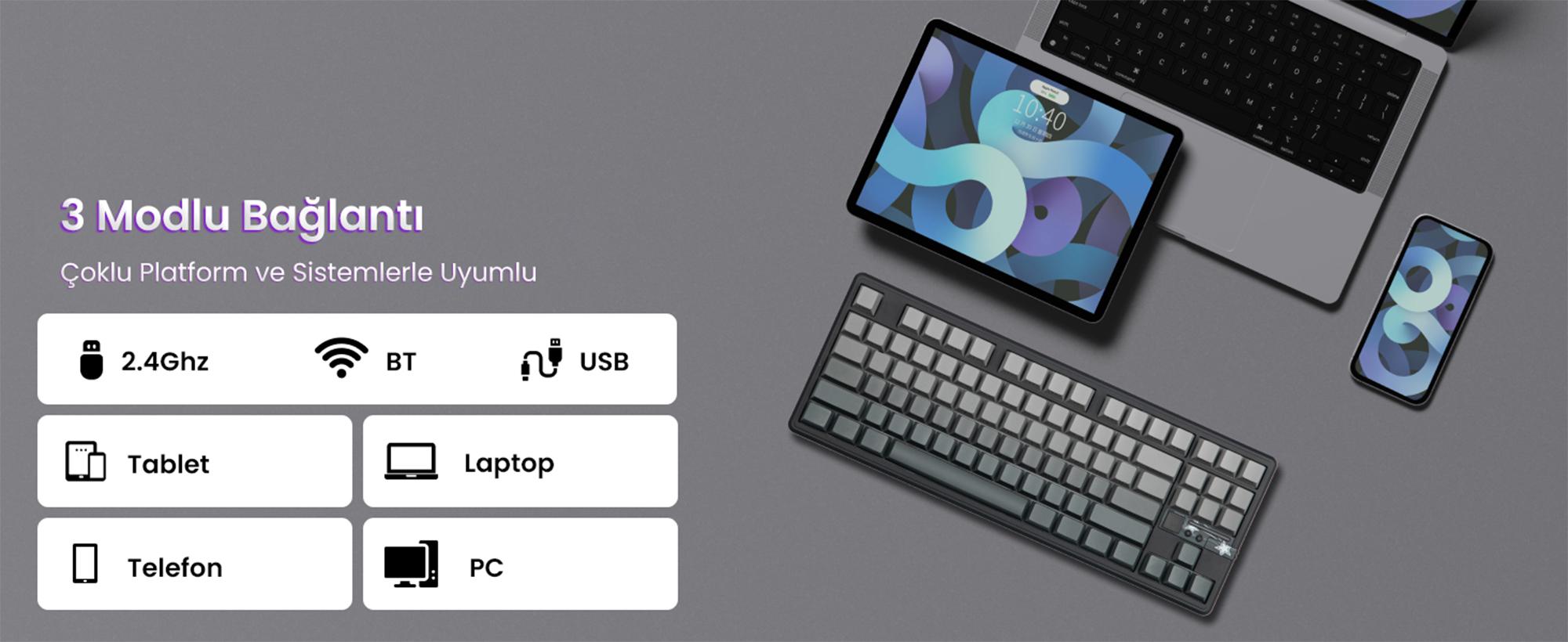 - Bağlantı Türleri: Kablolu (USB-C), 2.4Ghz USB Alıcı, Bluetooth