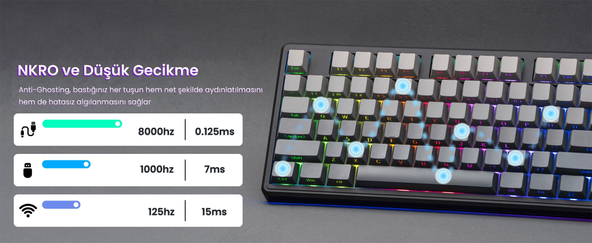 AULA F87 PRO V2, farklı kullanım senaryolarına uyum sağlayabilen üç farklı bağlantı seçeneğine sahiptir. Bu sayede kullanıcılar kablolu veya kablosuz kullanım arasında kolayca geçiş yapabilir. USB-C kablolu bağlantı, rekabetçi oyunlar için oldukça düşük olan 0.125 ms gecikme süresi sunarak maksimum tepki süresi sağlar. 2.4GHz kablosuz bağlantı seçeneği, yalnızca 7 ms gecikme ile stabil ve hızlı bir kablosuz deneyim sunar. Bluetooth bağlantı ise 15 ms gecikme süresi ile günlük kullanım ve çoklu cihaz geçişleri için pratik bir çözüm oluşturur.