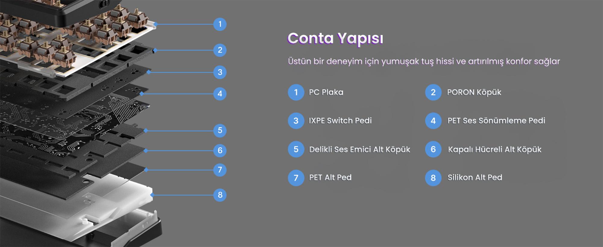 - Yapı: Yumuşak Conta (Creamy Gasket), Plate-Mount Stabilizer