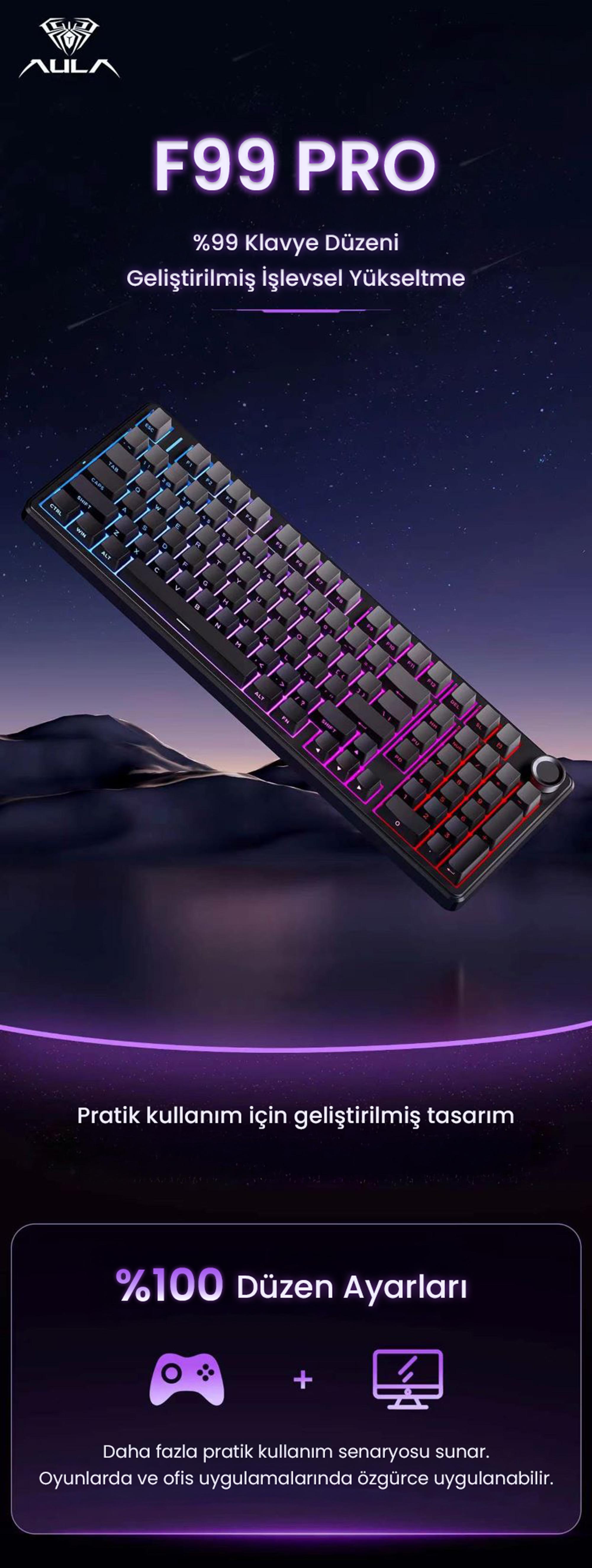 AULA F99 Pro, gasket yapısı sayesinde yumuşak, dengeli ve sessiz bir yazım hissi sunan bir klavye olarak öne çıkar. PCB tek tuş slotlama teknolojisi titreşimleri azaltır ve tuş basımlarını daha kararlı hâle getirir. Gövdesi sağlam malzemelerden üretilmiştir ve uzun kullanım ömrü için tasarlanmıştır. Hot-swap yuvaları, dilediğiniz mekanik switch ve keycap modelleriyle tam kişiselleştirme imkânı sağlar.