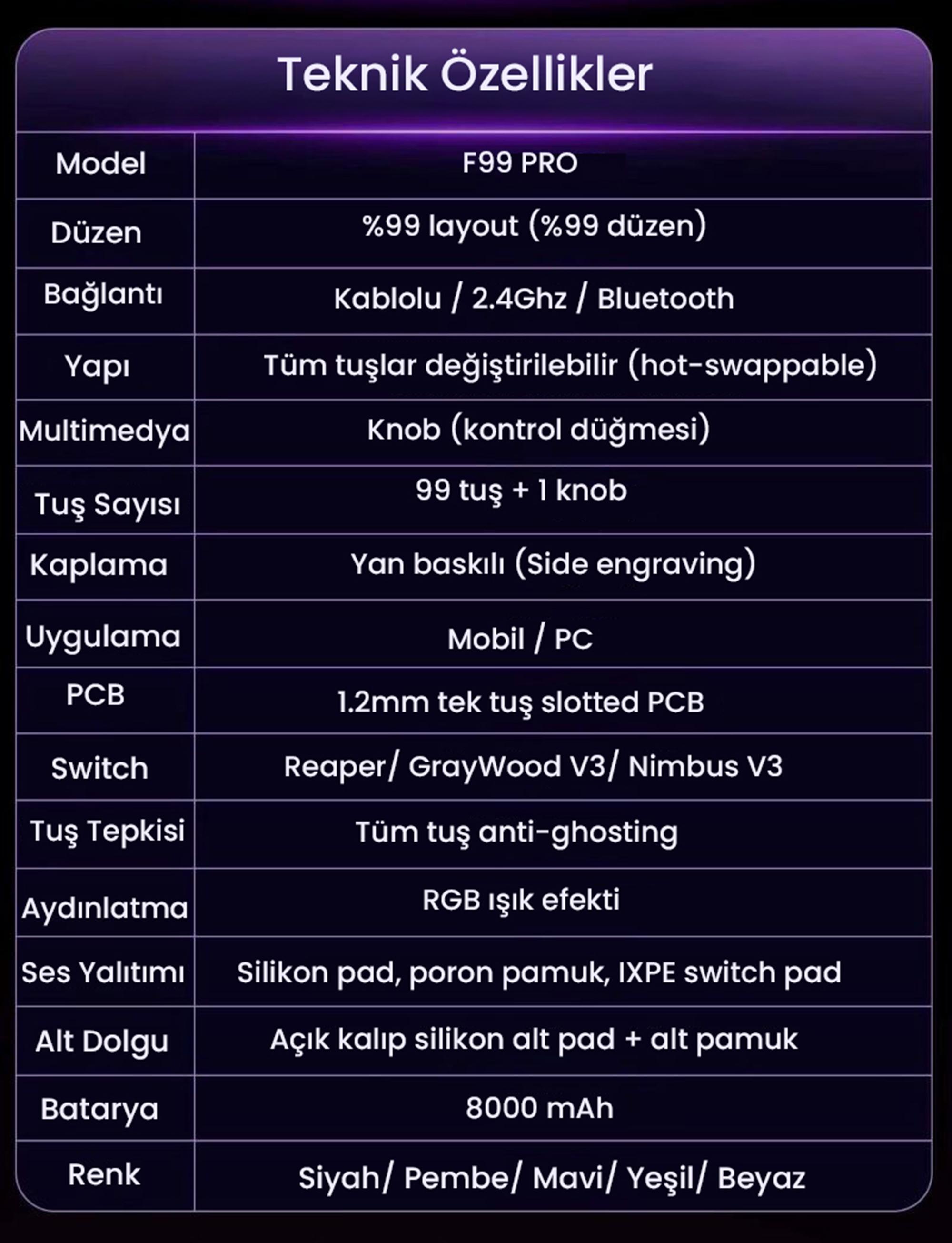 - Tuş Sayısı: 99 Tuş + 1 Multimedya Düğmesi (%99 Layout)