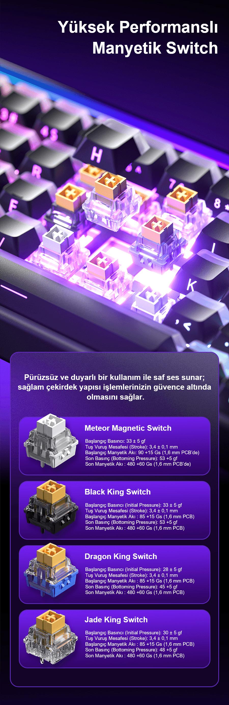 Bu manyetik klavye, geleneksel mekanik klavyelerin ötesine geçerek Meteor manyetik switch teknolojisini kullanır. Her manyetik switch, Hall Effect sensörü ile donatılmıştır ve 33 gf tetikleme kuvveti sunar. Ayrıca, 0.01 mm hassasiyet ayarı sayesinde kullanım deneyimini tam olarak kişiselleştirmenize olanak tanır. Meteor Switch’ler sayesinde daha uzun ömürlü ve tutarlı bir performans elde edersiniz.