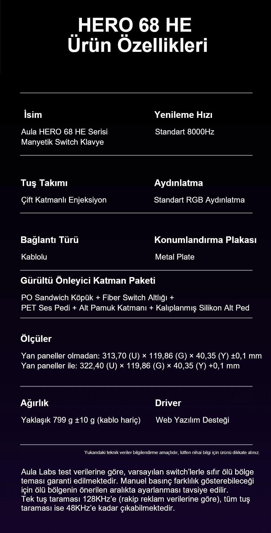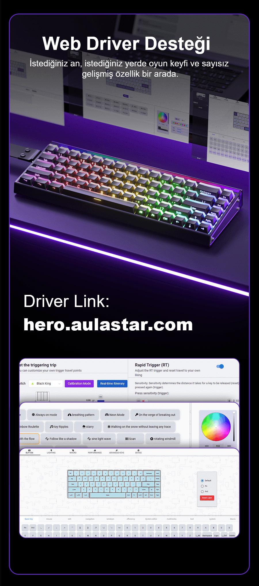 Aula Hero68 HE, profesyonel oyuncular ve ileri seviye kullanıcılar için tasarlanmış, yüksek performanslı bir manyetik klavyedir. Hall Effect anahtar teknolojisi, ultra düşük gecikme süresi ve kişiselleştirilebilir tuş tepkisiyle her vuruşta hız ve hassasiyet sunar. Estetik tasarımı, dayanıklı yapısı ve gelişmiş yazılım desteğiyle Hero68 HE, teknoloji ve performansı bir araya getirerek oyun ve çalışma deneyimini en üst seviyeye taşır.