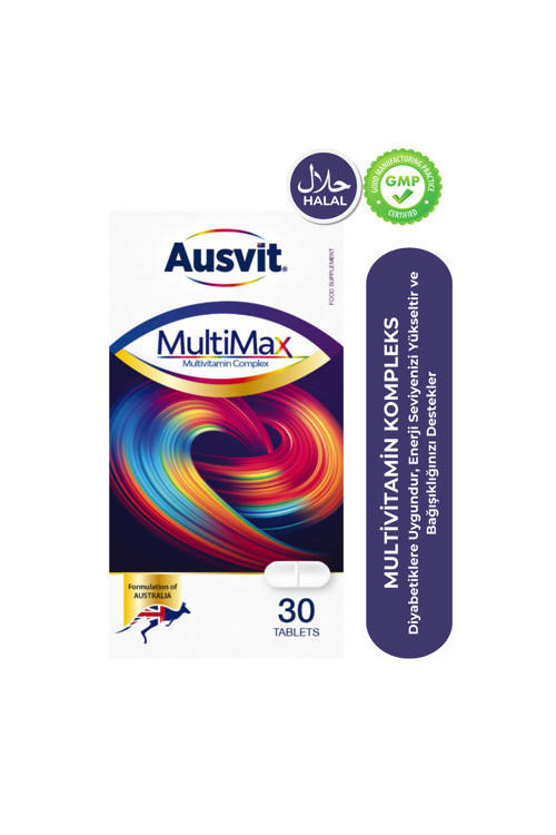 Ausvit Multimax Zengin multivitamin içeriği ile sizlerle! Gün boyu enerji desteği sağlamak için en iyi tercih Ausvit Multimax! Ausvit Multimax kilo aldırmayan, İçeriğinde cinnamon extract bulundurması sebebiyle diyabetik hastaların kullanımına uygun olan özel ve özgün bir vitamindir. 1 kutu içerisinde 30 tablet bulunmaktadır. Ausvit Multimax 1 tablet içeriği şu şekildedir.