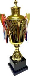 Kahverengi zemin kaplaması ve altın kaplama detaylarıyla şık bir görünüm sergileyen bu kupa, spor etkinliklerinde prestijli bir ödül olarak öne çıkar.