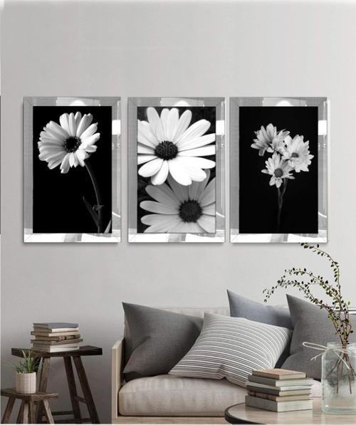AVM19 Siyah Beyaz Pleksi Çerçeveli Papatya 3Lü Tablo