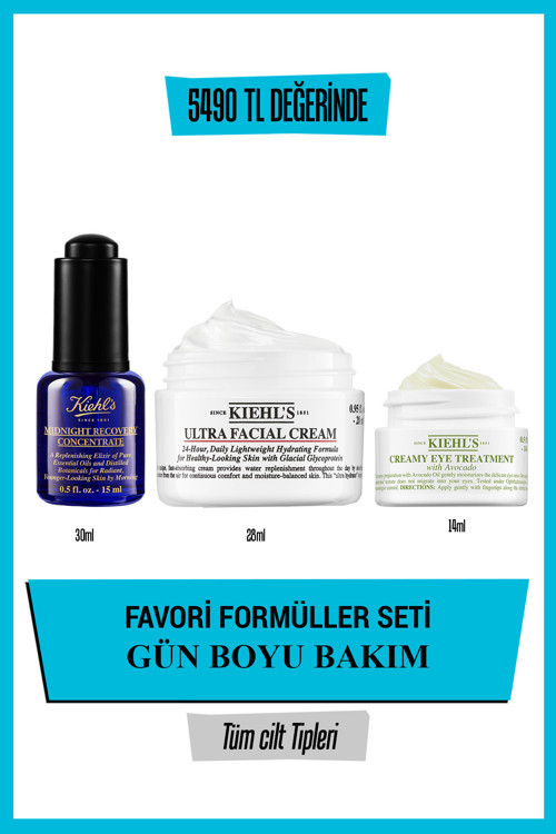 Creamy Eye Treatment with Avocado (14 ml - Orijinal Boy): Avokado Yağı içeren benzersiz formülü ile göz çevresine yoğun nem veren göz bakım kremimiz. Yağ içinde su molekülü şeklindeki benzersiz formülü, göz çevresine nem bombardımanı ile anında canlılık ve tazelik kazandırır. Klinik olarak kanıtlanmış* sonuçlara göre %32 daha az şişkinlik görünümü, %11 daha aydınlık görünüm, gün boyu nemlendirme sağlar. Kiehl's ipucu: Avokadolu göz kremimiz harika bir makyaj bazı olarak kullanılabilir! Ultra Facial Cream (28 ml): Efsane nemledirici ile 2.3 kat daha nemli bir cilt. Hafif yapılı ve 24 saat süren nemlendirme etkili formülü ile cildin her bölgesinde 2.3 kat daha fazla nemlendirme etkisi sağlar. Buzul glikoproteinleri ve zeytinden elde edilen skualan ile formüle edilen nemlendirici, tüm cilt tiplerinin kullanımı için uygundur. Midnight Recovery Concentrate (15 ml): Akşam sefası ve lavanta yağı ile formüle edilen Midnight Recovery, cilt görünümünü yenileyici bir gece bakımı sunuyor. Cildin gece onarılma ve yenilenme sürecini destekleyerek yaşlanma karşıtı bir bakım sağlayan bu gece serumu, temel ve botanik yağlardan oluşan formülü ile dikkat çekiyor. Botanik ve temel yağlar üzerindeki iki yıllık araştırmalar sonucunda geliştirilen formülü, yumuşak ve aydınlık bir cilt görünümü sağlıyor. İçeriğinde yer alan doğal kaynaklı yağlar sayesinde sabah daha canlı ve genç görünen bir cilt ile uyanmanı sağlar.. Midnight Recovery Concentrate: Akşam sefası ve lavanta yağı ile formüle edilen Midnight Recovery, cilt görünümünü yenileyici bir gece bakımı sunuyor. Cildin gece onarılma ve yenilenme sürecini destekleyerek yaşlanma karşıtı bir bakım sağlayan bu gece serumu, temel ve botanik yağlardan oluşan formülü ile dikkat çekiyor. Botanik ve temel yağlar üzerindeki iki yıllık araştırmalar sonucunda geliştirilen formülü, yumuşak ve aydınlık bir cilt görünümü sağlıyor. İçeriğinde yer alan doğal kaynaklı yağlar sayesinde sabah daha canlı ve genç görünen bir cilt ile uyanmanı sağlar..Ultra Facial Cream:Nem kaybıyla savaşmak için ihtiyaç duydukça gece veya gündüz temiz cilde uygulayın.Creamy Eye Treatment with Avocado:Yağ içinde su molekülü şeklindeki benzersiz formülünü en iyi şekilde uygulamak için, yüzük parmağınıza az miktarda alıp, iki yüzük parmağınız arasına ısıtın. Isıttıktan sonra cildi aşağıya doğru çekmeden nazikçe tampon hareketlerle değdirerek ürünü göz çevresindeki kemik boyunca uygulayın. Göz çevresine verdiği canlılık ve nemin tadını çıkarın!Kiehl's İpucu:Avokadolu göz kremimiz harika bir makyaj bazı olarak kullanılabilir!