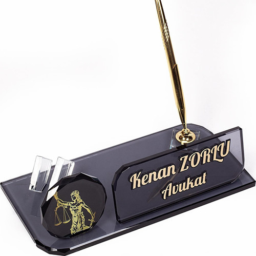 Füme renk kristal kullanılarak tasarlanmış olan masa isimliğimiz avukatlara, hakim ve savcılara özel olarak hazırlanmıştır. Kristal üzerine themis heykeli baskısı yapılmış olup, altın renk aksesuarlarla dekore edilmiştir. Ürünlerimizde birinci sınıf kaliteli kristal kullanılmış olup, özel parlatma işlemi uygulanmıştır.