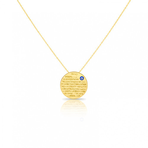 Bu eşsiz ve anlamlı kolye ile inancınızı ve maneviyatınızı şık bir şekilde taşıyın. Yuvarlak madalyon üzerindeki Ayet-el Kürsi, en ince detayına kadar titizlikle, son teknoloji lazer kesim ve lazer yazım tekniği kullanılarak işlenmiştir. Bu üretim tekniği, yazıların netliğini ve kalıcılığını garanti eder.