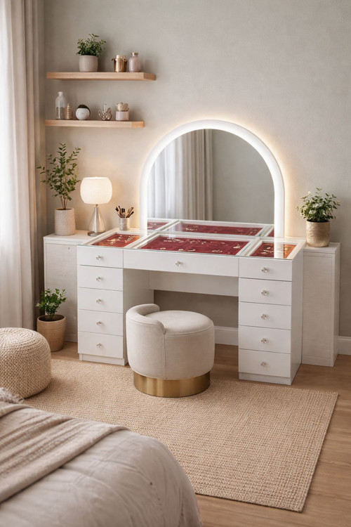 LED Aynalı Cam Üstlü Makyaj Masası – Modern & Fonksiyonel Tasarım
