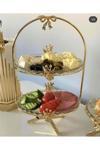 İki katmanlı tasarımı sayesinde hem tekli hem de çift kişilik servisler için uygun olan gold renkli cam sunumluk setimiz, klasik ve şık bir görünüm sunar.