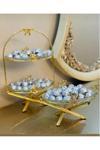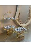 İki katmanlı tasarımı sayesinde hem tekli hem de çift kişilik servisler için uygun olan gold renkli cam sunumluk setimiz, klasik ve şık bir görünüm sunar.