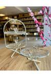 İki katmanlı tasarımı sayesinde hem tekli hem de çift kişilik servisler için uygun olan gümüş renkli cam sunumluk setimiz, klasik ve şık bir görünüm sunar.