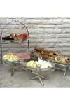 İki katmanlı tasarımı sayesinde hem tekli hem de çift kişilik servisler için uygun olan gümüş renkli cam sunumluk setimiz, klasik ve şık bir görünüm sunar.