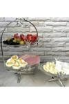 İki katmanlı tasarımı sayesinde hem tekli hem de çift kişilik servisler için uygun olan gümüş renkli cam sunumluk setimiz, klasik ve şık bir görünüm sunar.