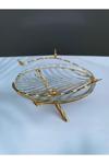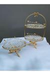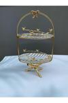 İki katmanlı tasarımı sayesinde hem tekli hem de çift kişilik servisler için uygun olan gold renkli cam sunumluk setimiz, klasik ve şık bir görünüm sunar.