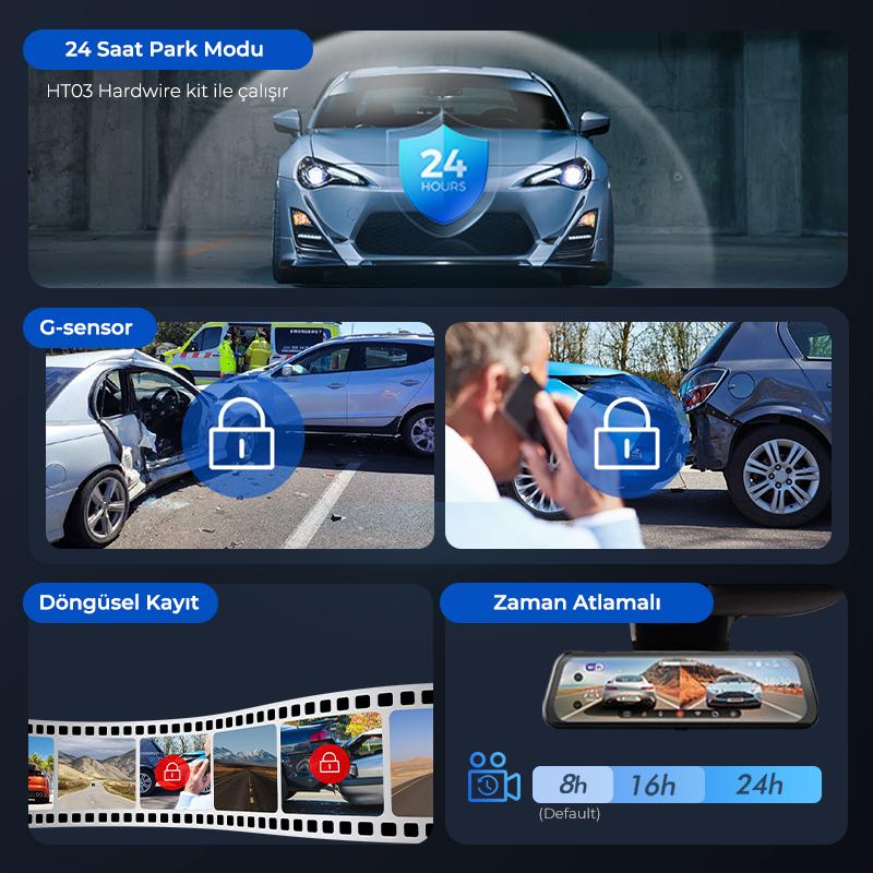 AR09 Wifi Tam Ayna, park halindeyken aracı güvence altına almak için kullanışlı bir otomatik Zaman Atlamalı park fonksiyonuna sahiptir. Bu Zaman Atlamalı modda, kamera her saniye bir fotoğraf çeker ve daha sonra video olarak oynatır. Bu, fotoğrafın canlı görünmesini sağlayan kendine özgü bir karaktere sahiptir. Zaman Atlamalı mod sayesinde videolar çok fazla yer kaplamaz ve bu nedenle SD kart dolmadan çok uzun süre kaydedilebilir. Sürekli güç kaynağı ile birlikte, aracın kontağı kapatıldığında park pozisyonu otomatik olarak devreye girer ve araç çalıştırıldığında normal kayıt devam eder.