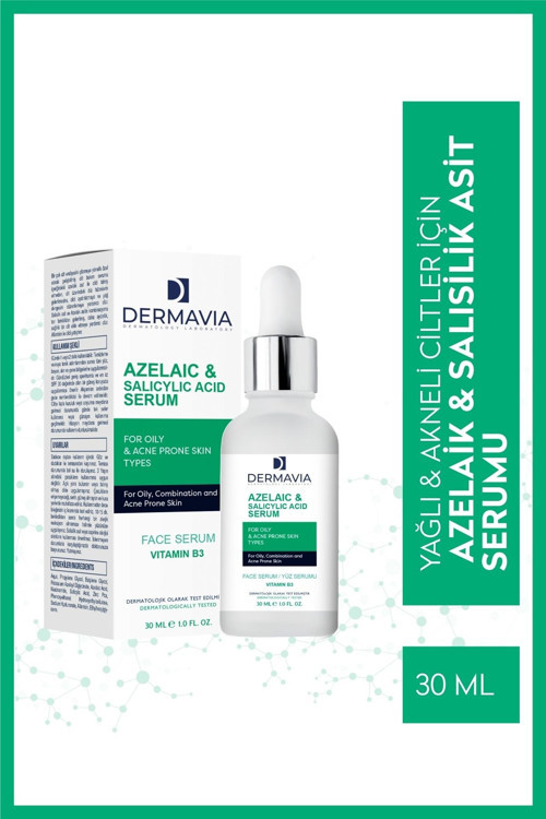 DERMAVIA YAĞLI AKNE EĞİLİMLİ CİLT TİPLERİ İÇİN YÜZ SERUMU Birçok cilt endişesini çözmeye yönelik özel olarak geliştirilmiş cilt bakım serumu içeriğindeki azelaik asit ile cildi tahriş etmeden, cilt üzerindeki ölü hücrelerin giderilmesine, cildi aydınlatmaya ve yağ dengesini düzenlemeye yardımcı olur.
