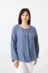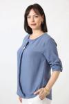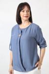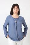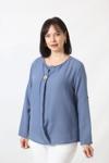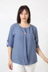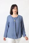Moda Berray B-0173 KOLU APOLETLİ YAKASI DÜĞME AKSESUARLI GİZLİ PİLELİ KETEN KADIN BÜYÜK BEDEN İNDİGO BLUZ