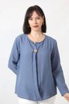 B-0173 KOLU APOLETLİ YAKASI DÜĞME AKSESUARLI GİZLİ PİLELİ KETEN KADIN BÜYÜK BEDEN İNDİGO BLUZ