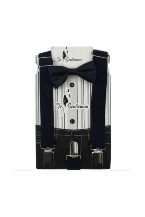 Çocukların rahatlığı düşünülerek tasarlanmış, lacivert renkli pantolon askısı ve papyon seti, şıklığı ve konforu bir arada sunar