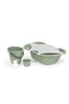 Giderli büyük banyo küveti (50 lt) Bebek banyo kovası (12 lt) Bebek banyo maşrapa (1,25 lt) Kuş tüyü banyo süngeri Banyo filesi.