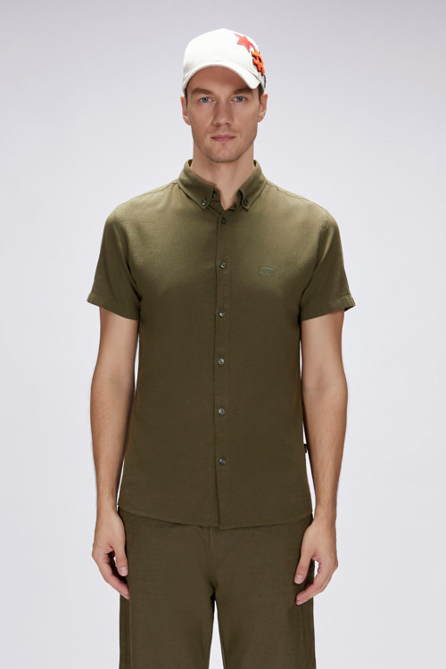 Şık ve rahat haki kısa kollu gömlek, günlük kullanıma ve sıcak havalara uygun ideal parça. Modern kesimiyle her kombine kolayca uyum sağlar.