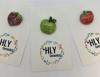 - El yapımı üçlü seramik charm seti; mor erik, yeşil elma ve kırmızı domates figürlerinden oluşur.