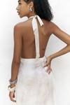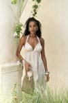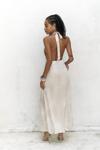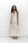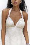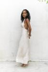 Üçgen kesim, boydan bağlamalı uzun elbise. Ahşap boncuk detaylı, etek ucu geniş kesim.Astarsız.
