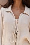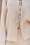 Müslin takım, yakalı, uzun kollu, önü ahşap boncuklu ve ipli gömlek.