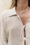 Müslin takım, yakalı, uzun kollu, önü ahşap boncuklu ve ipli gömlek.