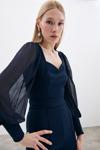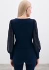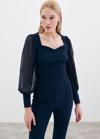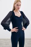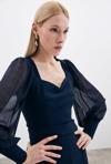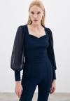 Kalp yaka, tam kalıp, yan fermuarlı, manşetli ve şifon kol bluz.