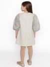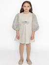 Simli bej kumaş detaylı balon kollu elbise.