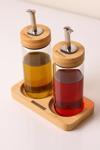 bambu kapaklı cam yağlık sirkelik seti, 2’li yağ ve sirke şişesi, standlı cam şişe seti, mutfak yağlık sirkelik takımı, şık yağlık sirkelik, bambu kapaklı cam şişe, standlı yağ sirke seti