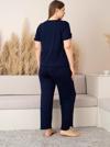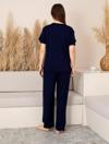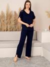 Omuz ve kol detaylarındaki ince dantel süslemeler, tasarıma zarif bir dokunuş katarken; rahat kesimi, uyku ve dinlenme saatlerinde maksimum hareket özgürlüğü sunar. V yaka tasarımı ve hafif salaş formuyla hem şık hem modern bir görünüm sağlar. Pantolonun bol paça yapısı ve küçük yırtmaç detayları şıklığı tamamlar.