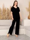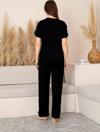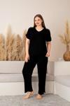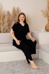 Omuz ve kol detaylarındaki ince dantel süslemeler, tasarıma zarif bir dokunuş katarken; rahat kesimi, uyku ve dinlenme saatlerinde maksimum hareket özgürlüğü sunar. V yaka tasarımı ve hafif salaş formuyla hem şık hem modern bir görünüm sağlar. Pantolonun bol paça yapısı ve küçük yırtmaç detayları şıklığı tamamlar.