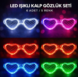 LED Işıklı Kalp Glow Pilli Parti Gözlüğü – 6 Adet / 5 Renk Set